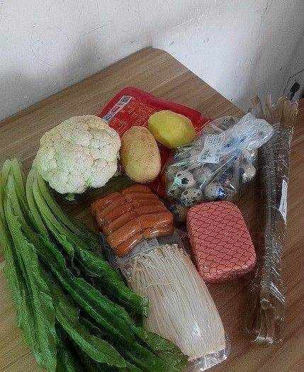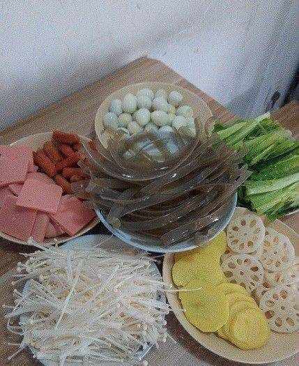 各式蔬菜肉類洗凈切好備用,如果有脆皮腸,切十字刀,不要切斷,留2厘米左右。我是為瞭拍照,如果自己做,完全不用裝盤,太麻煩,一邊切一邊下鍋就可以瞭