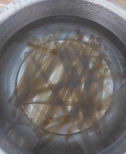 我喜歡火鍋粉,所以它是必須的,先掰斷冷水浸泡,如果著急,用熱水就可以。當然,不用它也行,看個人口味