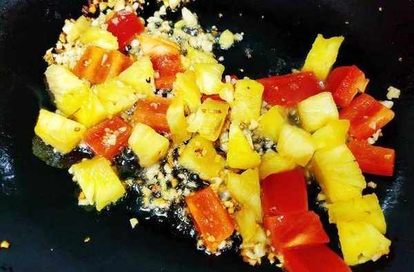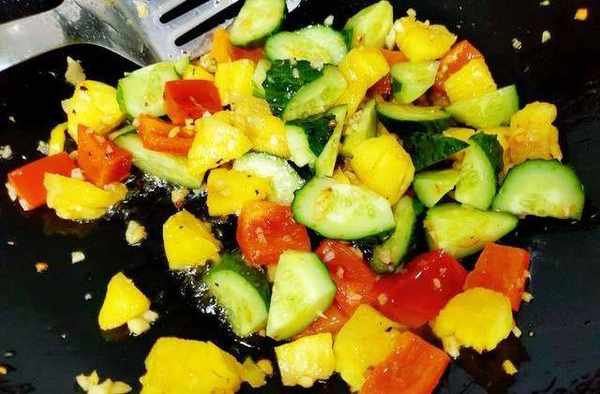 配菜提前切好,菠蘿,黃瓜,紅柿子椒我的菠蘿因為要給娃做菠蘿炒飯,要保留菠蘿皮,菠蘿肉是挖出來的,所以菠蘿肉不太工整,