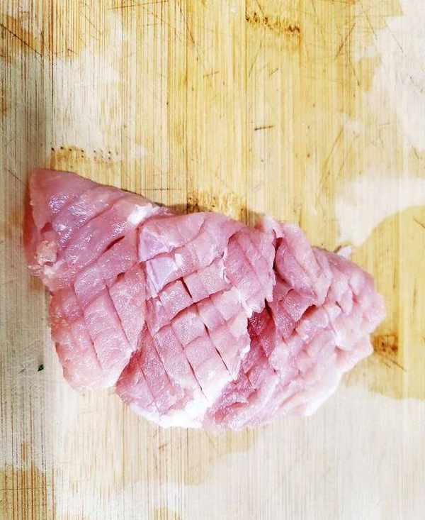 肉切成1厘米左右厚的大片,上面劃上魚鱗刀,這樣更加入味,口感更加嫩滑