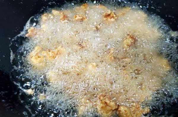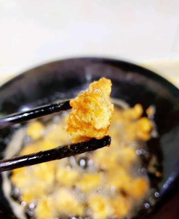 油熱後一個個放入肉塊,我感知油溫的方法是把手放在油鍋正上方,感覺到油溫升高後就放入肉塊,不能油溫過高,肉容易硬