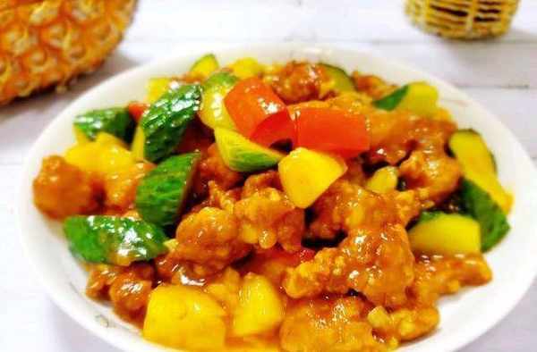 豬肉適量,菠蘿半個,紅柿子椒半個,黃瓜半根,蒜末適量,薑末適量,番茄醬1勺,白糖6勺,醬油1勺,白醋1勺,胡椒粉適量,料酒適量,鹽適量,生粉適量