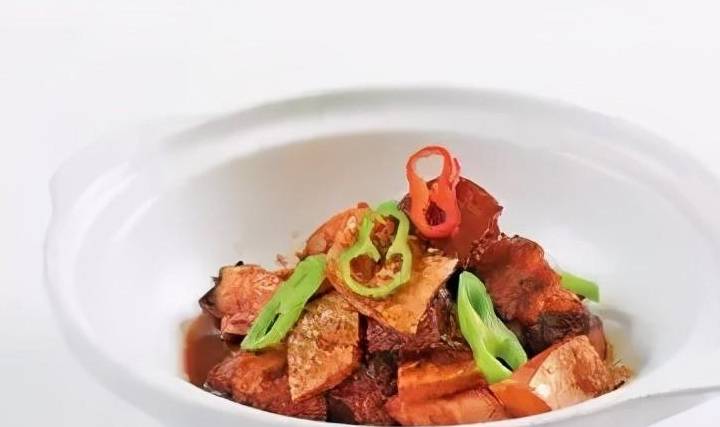 這道菜是在紅燒肉的基礎上改良而來,用土豬肉做菜,肉香味濃鬱,搭配泡醃後的魚肉一起燒制,豬肉吸收瞭魚肉的鮮味,變得更加鮮美。而魚肉則吸收瞭豬肉的油脂,緩解瞭菜肴的油膩感,同時也增加瞭魚肉的滑嫩度。