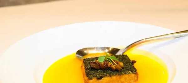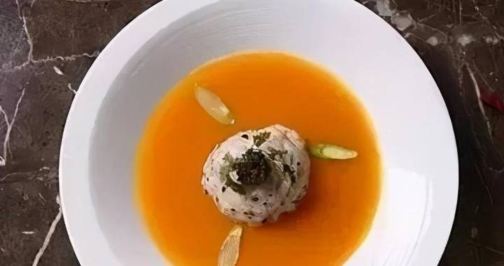 用南瓜汁做的湯底同樣是點睛之筆,金黃玉潤的顏色不但美觀,也讓菜品的營養價值更為突出。