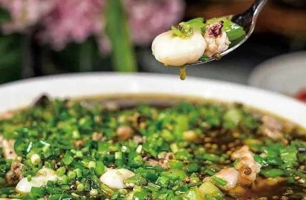 4.客人點菜時,將青魚肉放入裝有五花肉的沙鍋內,倒入蔥薑酒,用原湯小火燒15分鐘,用蒸魚豉油調味,撒入青、紅椒圈,離火上桌。
