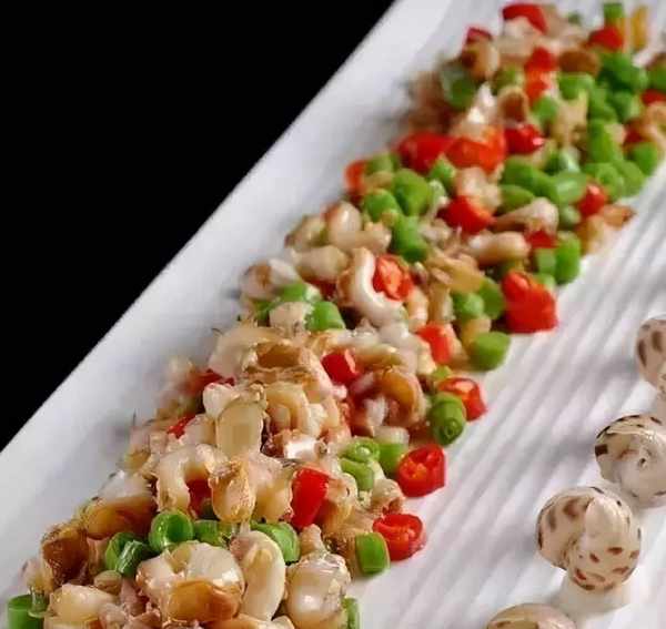 2.熱鍋裡放蔥油,下小米辣節炒出辣味後,把小花螺和鮮豇豆粒入鍋炒熟,邊炒邊調入鹽、味精和辣鮮露,翻炒勻便起鍋,淋花椒油便好。