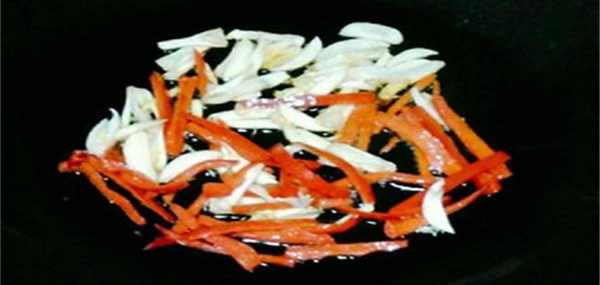 2、之後就可以起鍋燒油瞭,油熱瞭,就把茭白倒進去,繼續翻炒。然後炒到差不多發黃,就可以加點料酒、生抽、白糖進去瞭,差不多悶個5、6分鐘就可以瞭。