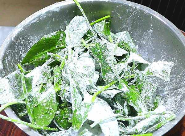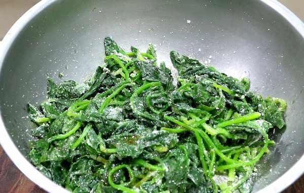 3.蒸好之後關火,將菠菜取出來,倒在拌菜盆中,趁熱抖散,避免粘連在一起,先撒上少許食鹽入底味,再澆上少許香油,用筷子拌勻。
