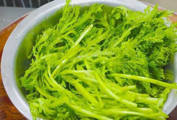 1、準備一把茼蒿,先用水淘洗幹凈,然後再控幹水分,放在菜板上,從中間切成兩半,放入盆中。