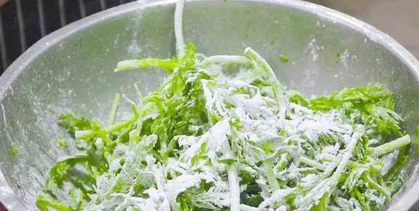 一般人做蒸菜是直接把面粉倒進盆中,這樣雖然簡單,但是容易蒸出來的不好吃,其實咱們可以先把面粉放幹鍋中小火炒一下,炒至微微發黃時,即可出鍋再拌菜即可。