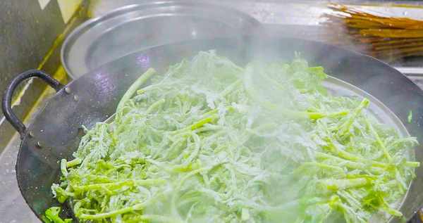 3、鍋內燒水,放上篦子,水燒開後,把茼蒿均勻的攤在篦子上面,蓋上鍋蓋,開大火蒸3分鐘左右。