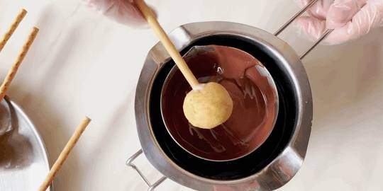 12、裹面巧克力隔熱水融化,先用手指餅幹粘點巧克力,戳緊蛋糕球,做凝固