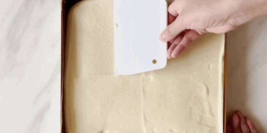 6、倒入鋪有油紙的烤盤(28*28),抹平,震去表面大氣泡,放入烤箱,中下層,150度,烤35分鐘