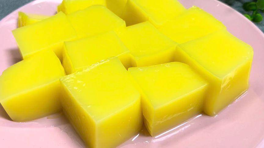 2、倒入盤中,放到冰箱冷卻定型,大概兩三個小時就可以瞭,摸起來嫩嫩滑滑,顏色金黃。用刀切成小塊,QQ彈彈的,可以撒點白糖,玉米豆腐就好瞭。