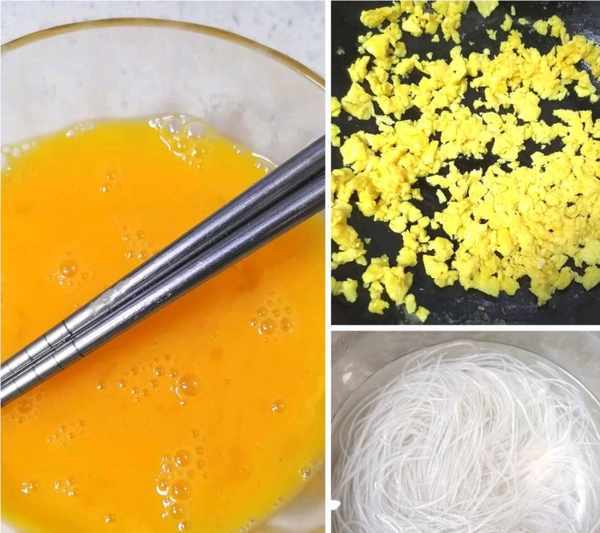 步驟3三個雞蛋液打散倒入鍋內,有點凝固就劃散,炒成雞蛋碎。70克粉絲提前用熱水泡軟,然後切碎。