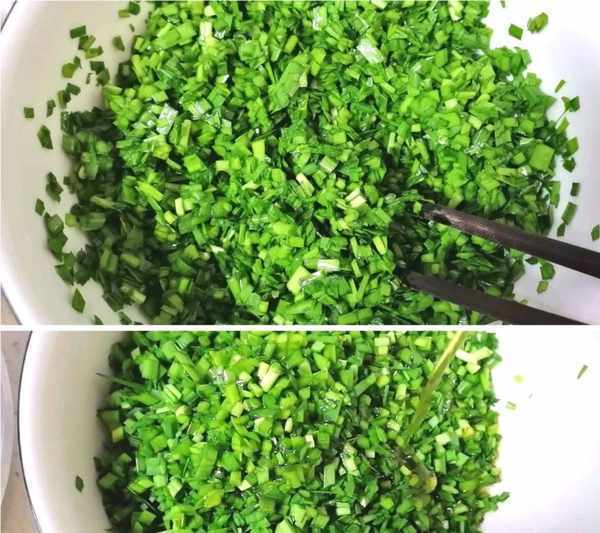 步驟2韭菜洗凈控水切末,加適量油拌勻防止出水。