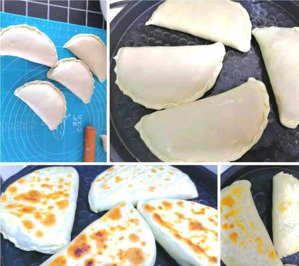 步驟5面團搓成長條分成10個小份,搟成橢圓形面皮放上餡,面皮對折把邊緣捏緊壓實。
