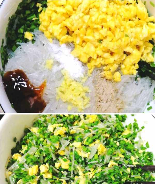 步驟4粉絲,雞蛋加到韭菜裡,加少許薑末,一勺蠔油,少許胡椒粉和適量鹽拌勻。