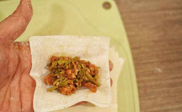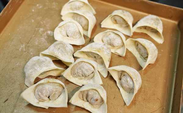 8、餛飩皮上下對折,捏緊封口,再左右對折捏緊即可,可以蘸水捏緊包好的餛飩放入烤盤裡