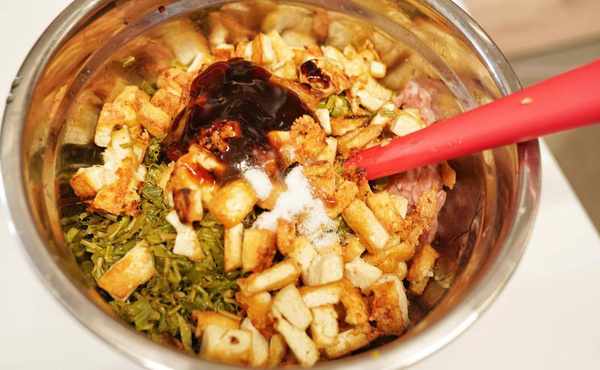 5、把焯燙好的香椿切碎放入料理盆裡,把煎好的豆幹也放入料理盆裡