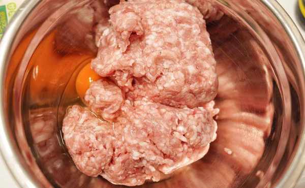 4、把豬肉糜放入料理盆裡,磕入一個雞蛋,把雞蛋攪拌至完全被豬肉吸收