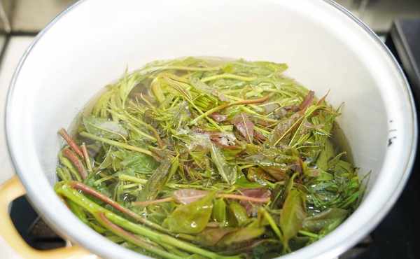 2、鍋裡燒開水後,放入去老梗的香椿焯燙,焯燙時加入3克鹽和5毫升植物油