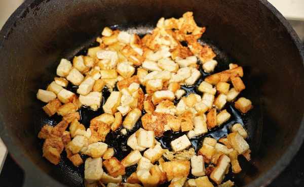 3、鍋裡熱油後放入切成5*2厘米的豆腐煎至表面金黃後撈出備用