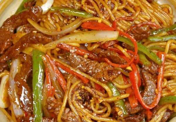 ③面條煮熟撈出過涼水,鍋中放入適量油,倒入牛肉炒至變色,倒入洋蔥,青紅椒炒香,倒入面條,倒入料汁翻炒均勻即可