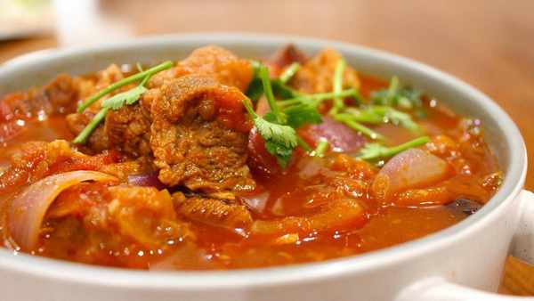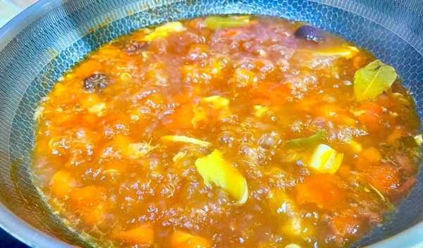 6.加入清水,大火燒開,因為要小火慢燉,轉用到砂鍋。水加到砂鍋的八分滿,把香料放進去,大火燒開後,轉小火慢燉,關火前20分鐘加剩下的番茄塊和洋蔥繼續燉。