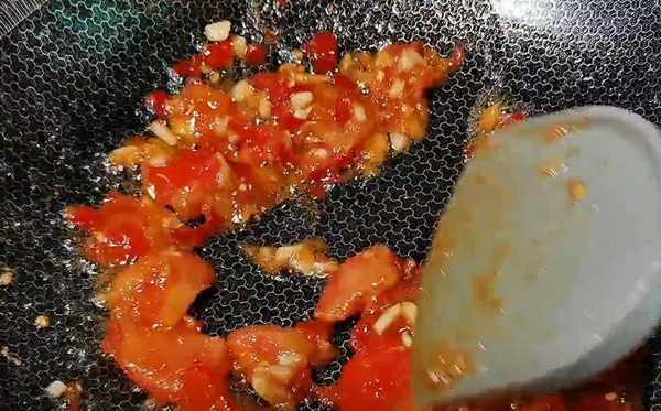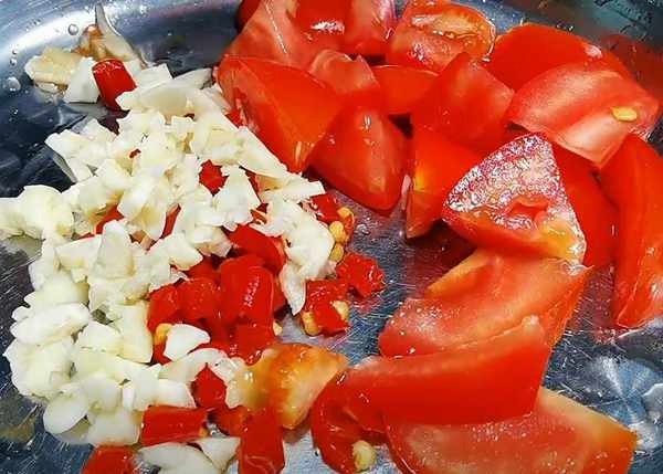 3.鍋中加適量食用油,油熱之後,放入蒜粒、辣椒和西紅柿,中小火翻炒均勻,加少許鹽,這樣西紅柿容易出痧。