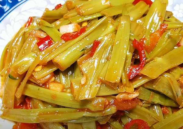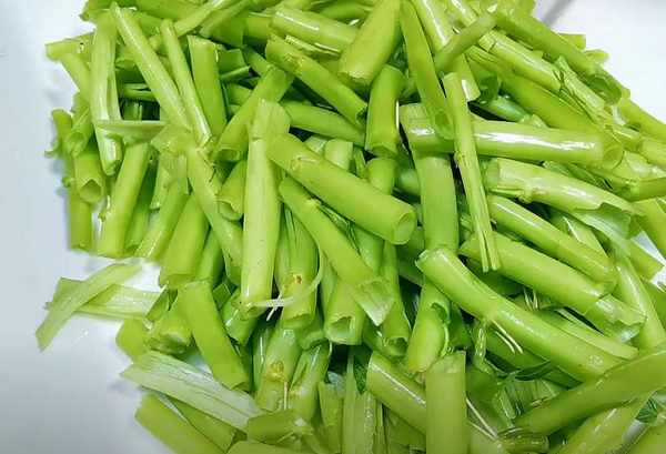 1.洗幹凈的空心菜梗用刀拍幾下,方便炒的時候入味,再切成小段,切好裝入碗中備用。