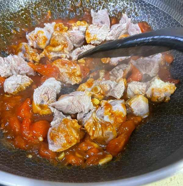 5.加入焯水好的牛肉,翻炒均勻,放入冰糖塊繼續翻炒