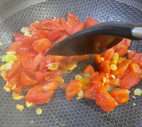 4.蔥、蒜切碎,鍋中放油炒香蔥、蒜碎,加三分之二番茄翻炒,調入適量生抽老抽和適量番茄醬