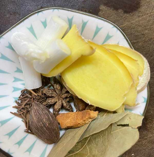 2.準備香料,八角、桂皮、香葉、迷迭香、蔥