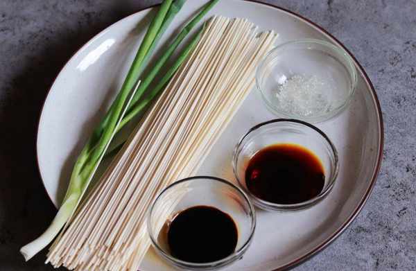 準備食材:細掛面、白胡椒粉、蔥、香油、老抽、白糖、生抽