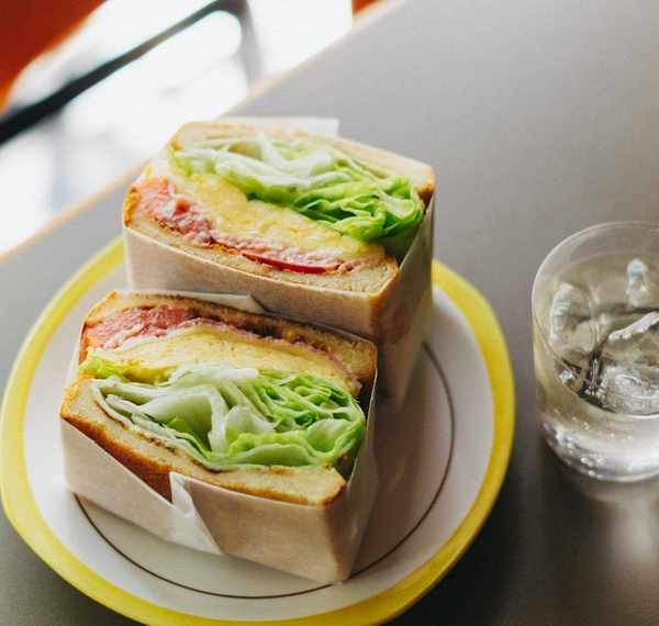 用刀將三明治切成兩半,即可享用。