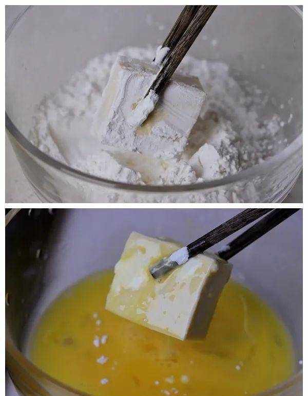 把切好的豆腐先放進碗裡均勻地裹上面粉,然後再放到雞蛋液裡面滾上一圈。
