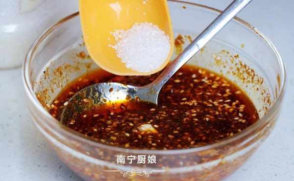 3、往裝有蒜末的碗裡加入適量的生抽、蠔油、孜然粉、辣椒粉和熟白芝麻、白糖、食鹽,然後攪拌均勻成一碗料汁。