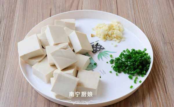 1、把我們買回來的北豆腐均勻地切成小方塊,把準備的兩根蔥切碎,大蒜的外皮去掉切成蒜末,裝在盤子裡備用。