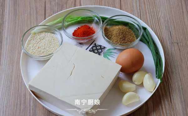 食材準備:一塊北豆腐,1個雞蛋,20克孜然粉,20克辣椒粉,20克白芝麻,15克大蒜,兩根香蔥