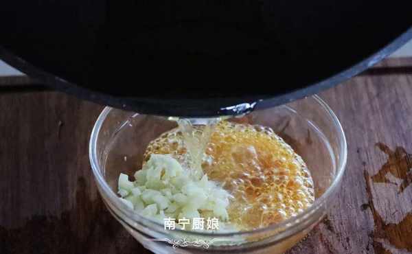 油熱之後把油倒入裝有蒜蓉的碗裡,爆出它的香味。