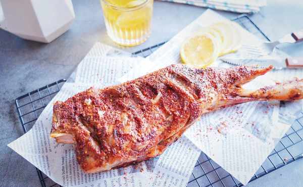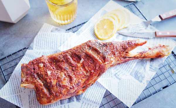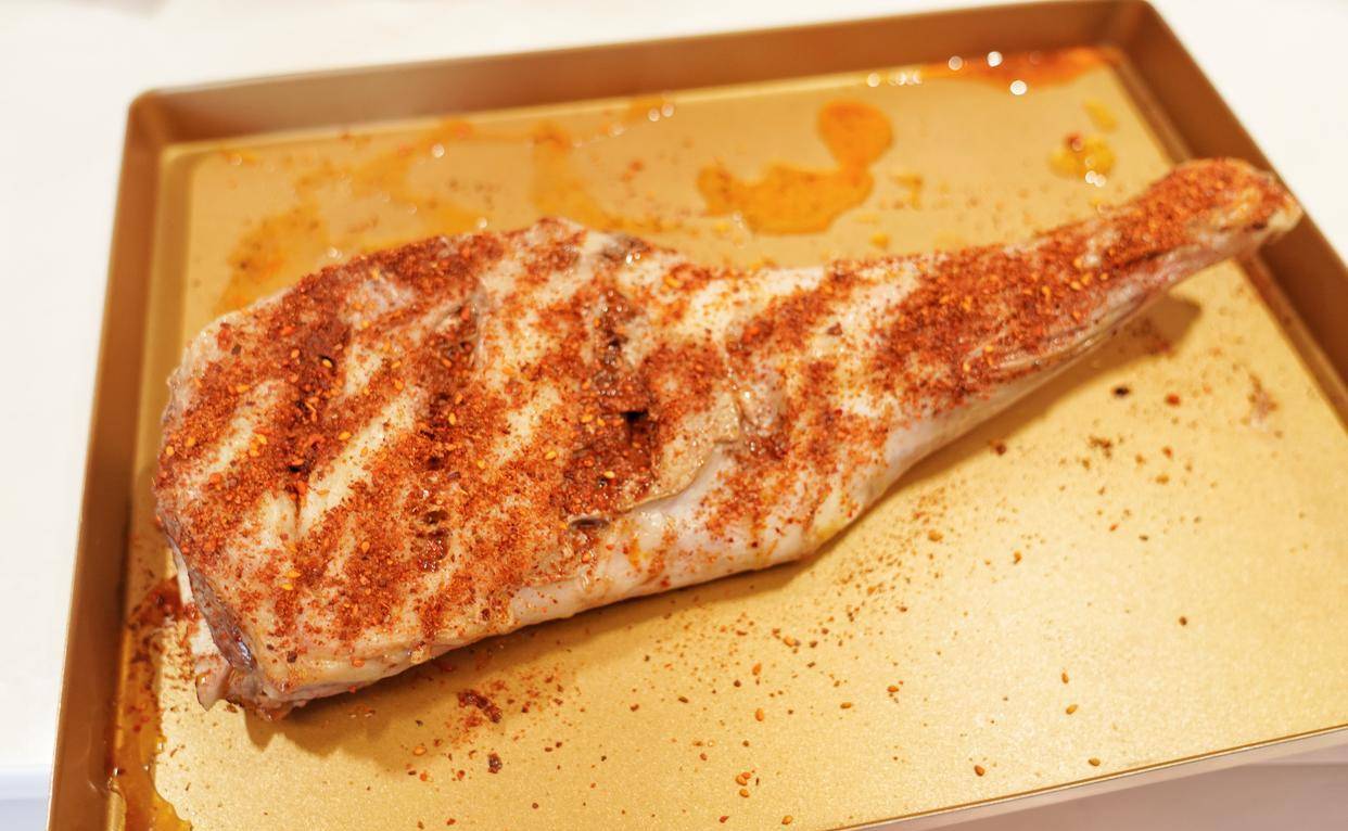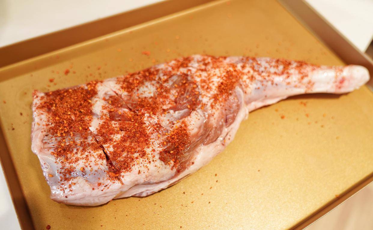 7、烤好後取出羊腿,翻另一面,均勻撒上孜然粉