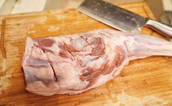 4、羊腿洗凈後,割除多餘的脂肪,並用刀把羊腿兩面劃幾刀