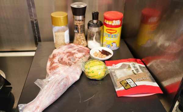 【檸香孜然香烤羊腿】羊前腿1腿,孜然粒10克,熟白芝麻10克,花生米20克,白砂糖5克,鹽10克,幹紅辣椒3個,雞粉10克,檸檬1個
