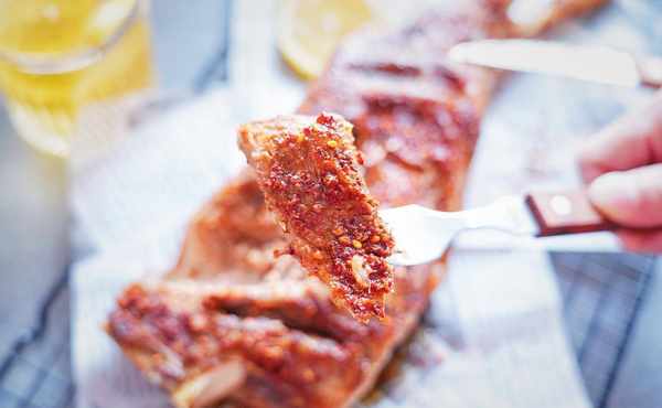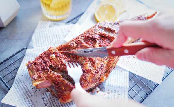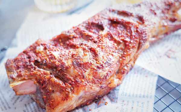 5、把制好的孜然粉均勻地撒在用廚房紙吸幹表面水分的羊腿一面上
