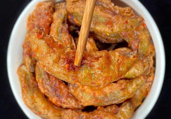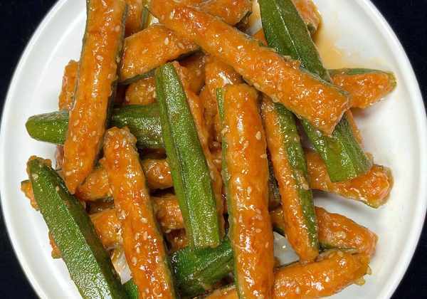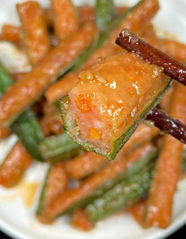 主要食材:黃秋葵,蝦滑,胡蘿卜碎,淀粉,黑胡椒粉,生抽,番茄醬,黃秋葵油炸後又爽口又酥脆,蝦滑鮮甜又彈牙,一上桌馬上就被搶光瞭。