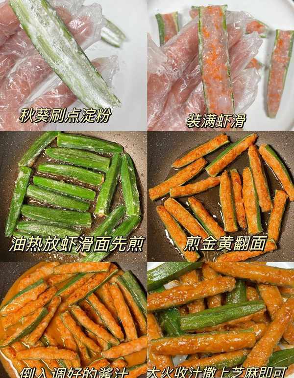 3、起鍋燒油5成油溫先把蝦滑的那一面放下鍋煎至定型,然後翻個面繼續中小火煎黃秋葵,接著倒入調制好的醬汁,開大火收幹湯汁撒上白芝麻,就可以出鍋開吃瞭。其實蝦滑也可以用在很多蔬菜盒子的餡料裡,比如上面的荷蘭豆餡料就可以用到蝦滑。