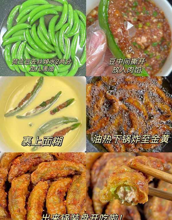 3、鍋裡油溫7成熱下入荷蘭豆,炸至金黃後就可以撈出瞭,控幹油脂撒點芹菜碎什麼的,就可以上菜瞭,餡料方面大傢可以根據自己口味微調,比如喜歡吃辣的可以加少許辣椒。