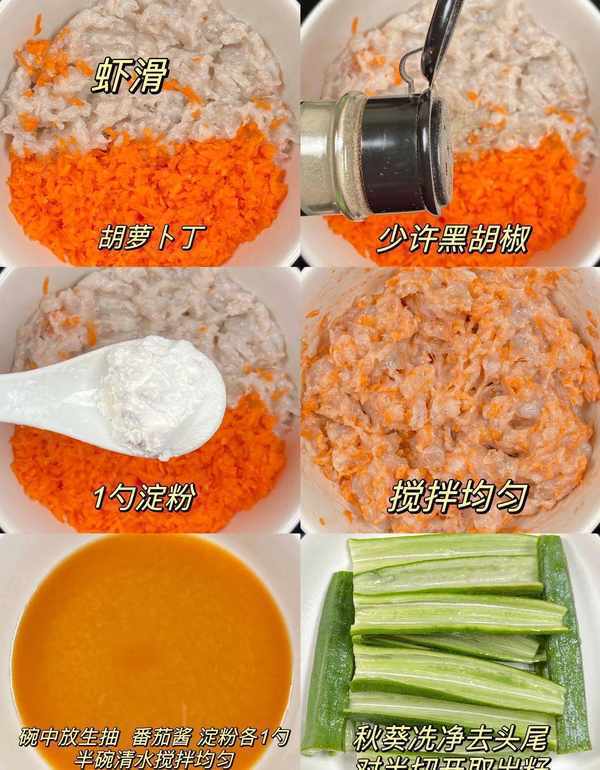 1、碗裡加入半碗的蝦滑,半碗的胡蘿卜碎,然後加入1勺淀粉,少許的黑胡椒粉,攪拌均勻醃制備用,在醃制蝦滑餡料的時候就可以處理黃秋葵瞭。