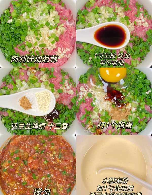 1、調制肉餡,碗裡加入肉末,半勺蒜末,半勺蔥花,1勺生抽,1勺蠔油,少許的鹽,胡椒粉和味精,攪拌均勻醃制10分鐘以上。